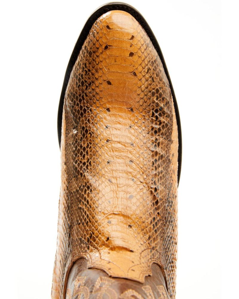 - Tan water snake vamp and brown shaft with western stitching