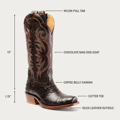 With proper care, Caiman leather boots will last for years. Be sure to let boots dry after exposure to wet conditions. Use a horsehair boot brush or a clean damp cloth to remove debris before cleaning and conditioning the leather. We recommend using Bickmore's Exotic.