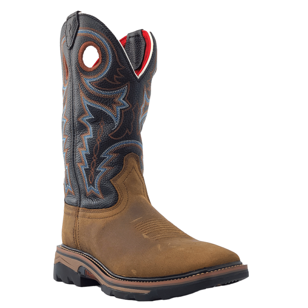 R. Watson presents these buffalo and cowhide square steel toe waterproof work boots. These work boots have a 10 row stitch pattern, pull holes, removable orthotic insole, EVA midsole and a block heel. They are EH, slip and oil resistant. 12" total in height.