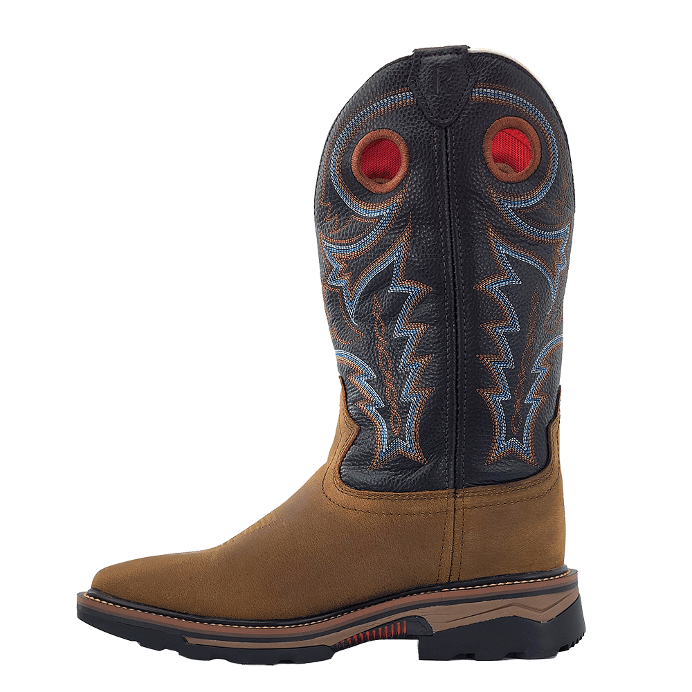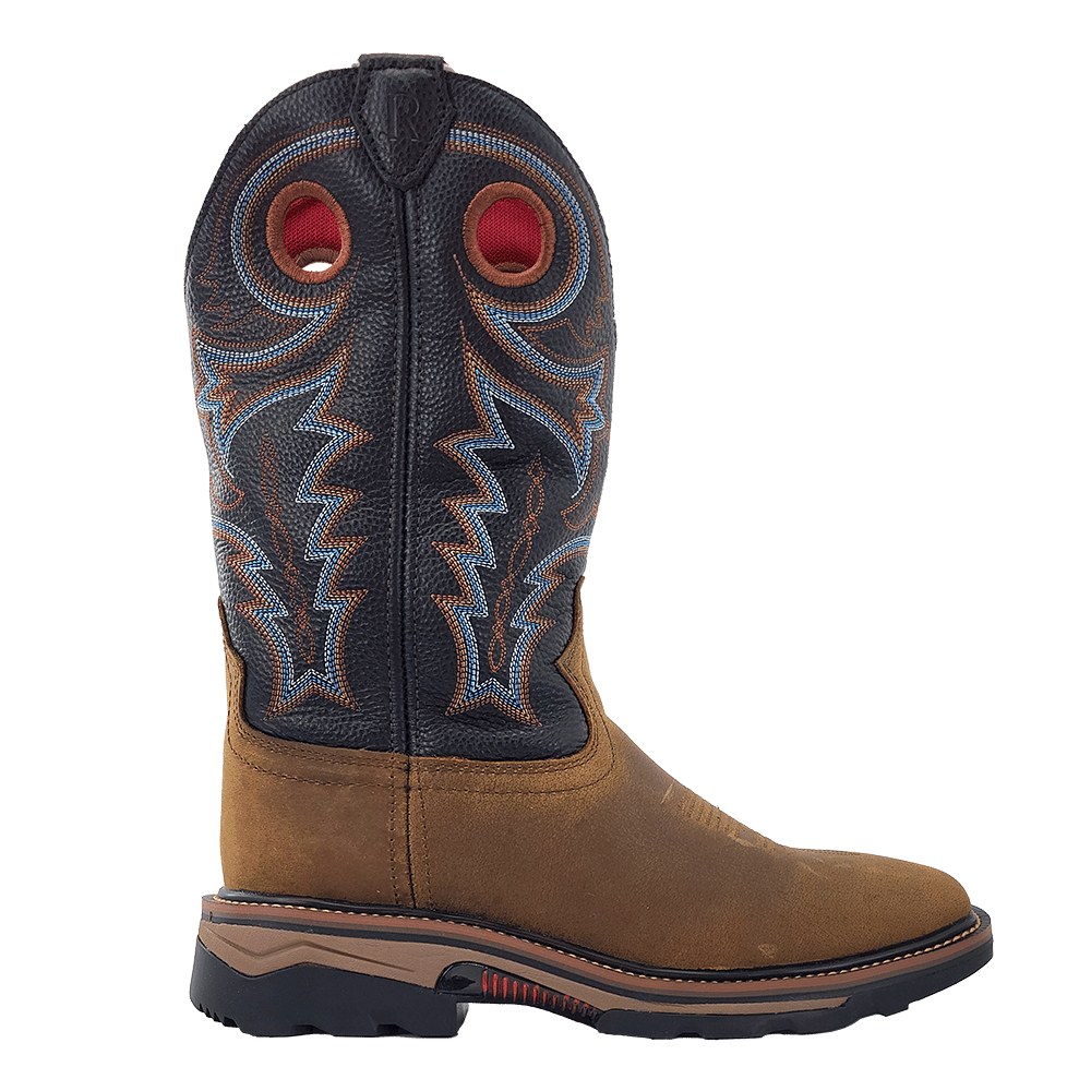 R. Watson presents these buffalo and cowhide square toe waterproof work boots. These work boots have a 10 row stitch patter, pull holes, removable orthotic insole, EVA midsole and a block heel. They are EH, slip and oil resistant. 12" total in height.