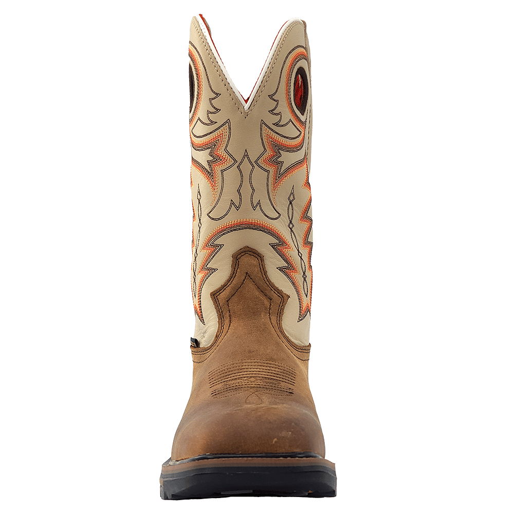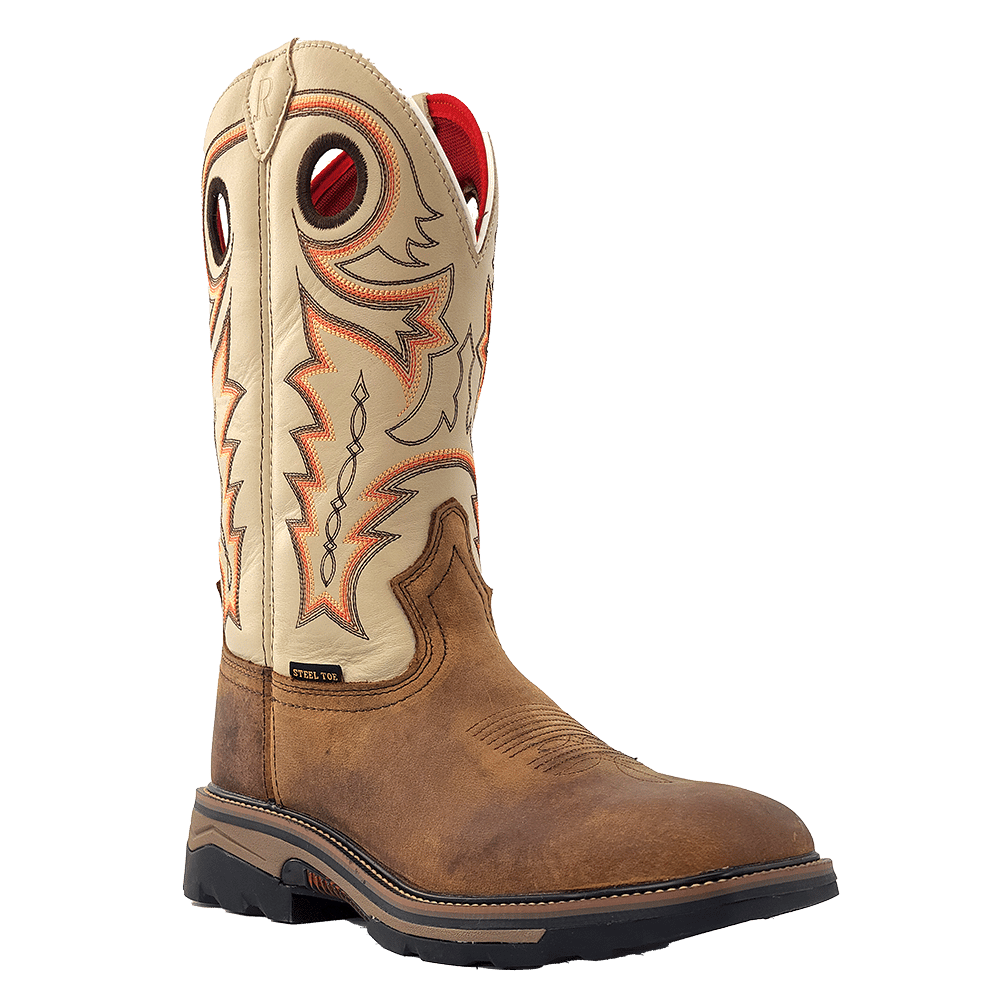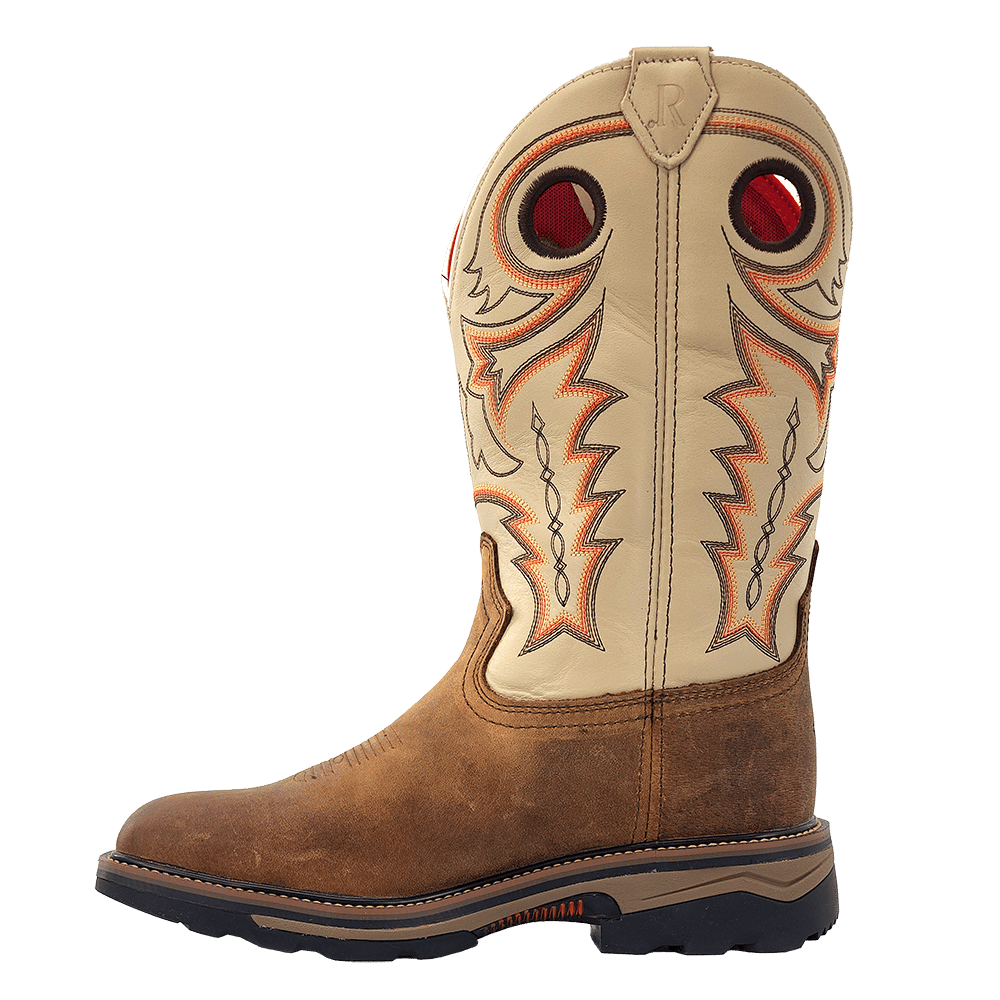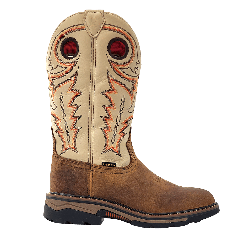 R. Watson presents these cowhide wide square toe work boots. These work boots have a 10 row stitch pattern, removable orthotic insole, EVA midsole, Vibram unit sole. They are EH, slip and oil resistant. 12" total in height.