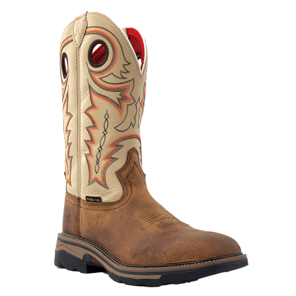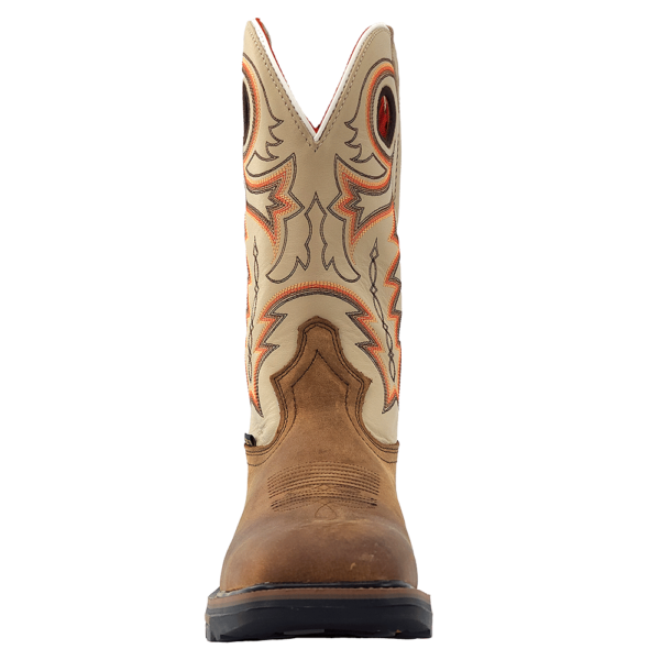 R. Watson presents these buffalo and cowhide wide square steel toe work boots. These work boots have a 10 row stitch pattern, removable orthotic insole, EVA midsole, medium duty rubber outsole. They are EH, slip and oil resistant. 12" total in height.