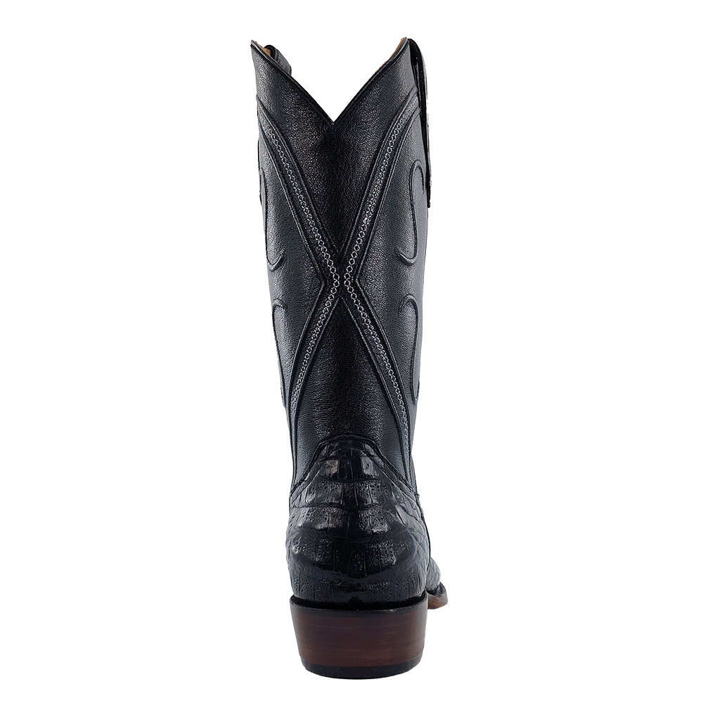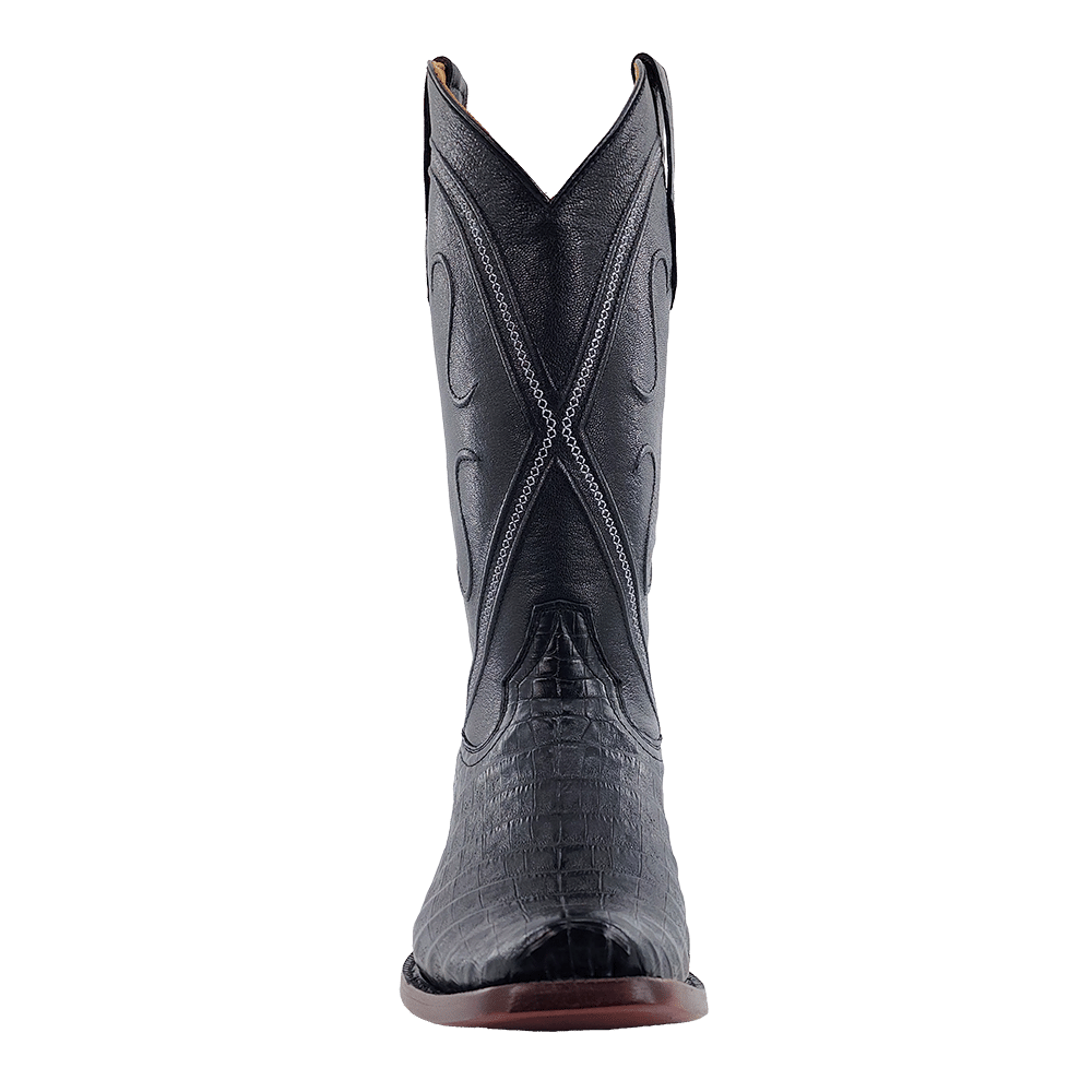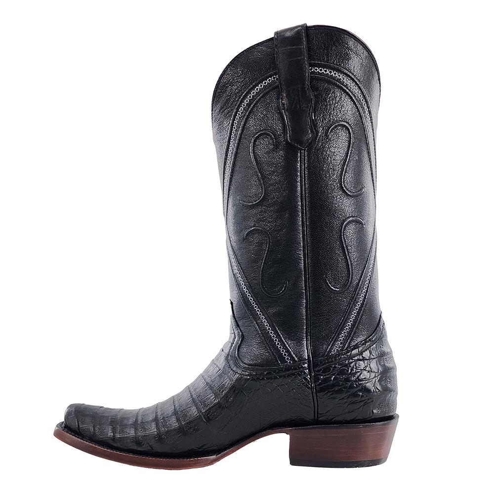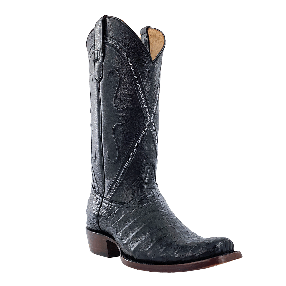 R. Watson presents these caiman belly and goat exotic western boots. These boots have a corded stitch pattern, R. Watson comfort system, all leather stacked heel, counters, solid steel shank, and 10 iron outsole. 13" total in height.