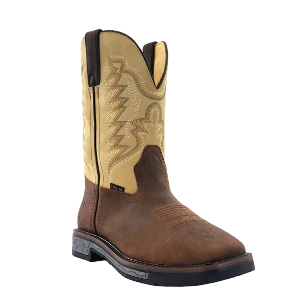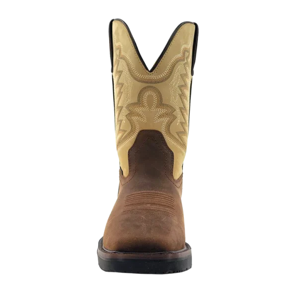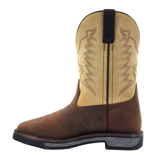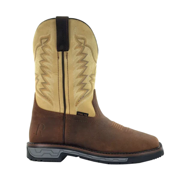 R. Watson presents these cowhide wide square steel toe work boots. These work boots have a 10 row stitch pattern, removable RW memory insole, molded EVA midsole, rubber outsole. They are EH, slip and oil resistant. 11" total in height.
