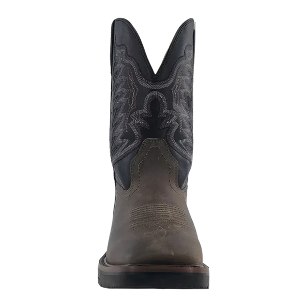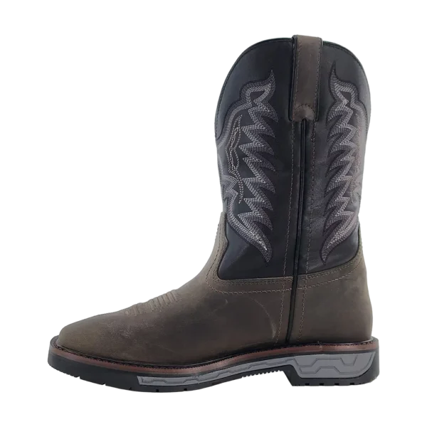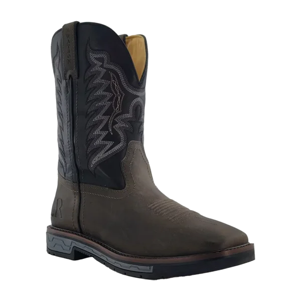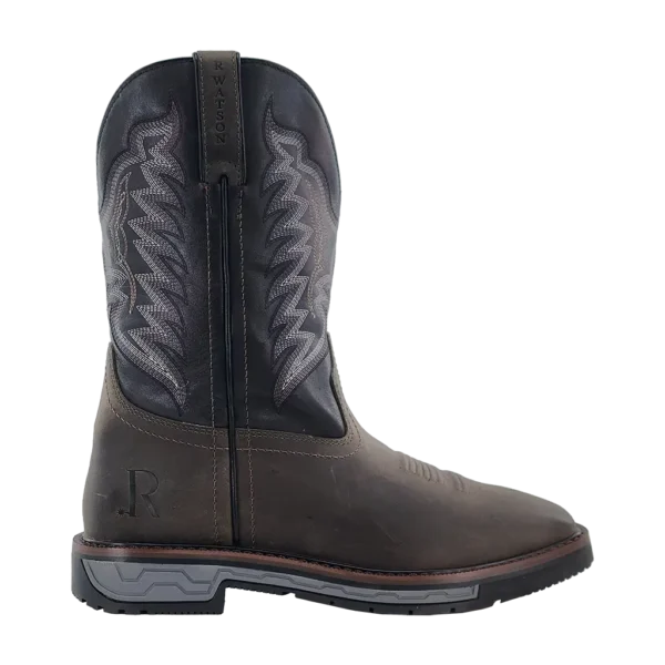 R. Watson presents these cowhide wide square toe work boots. These work boots have a 10 row stitch pattern, removable orthotic insole, molded EVA midsole, rubber unit outsole. They are EH, slip and oil resistant. 11" total in height.