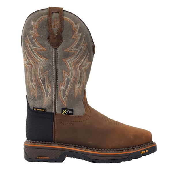 R. Watson presents these cowhide square toe waterproof work boots. These work boots have a 10 row stitch pattern, removable orthotic insole, EVA midsole, Vibram unit sole. They are EH, slip and oil resistant. 12" total in height.