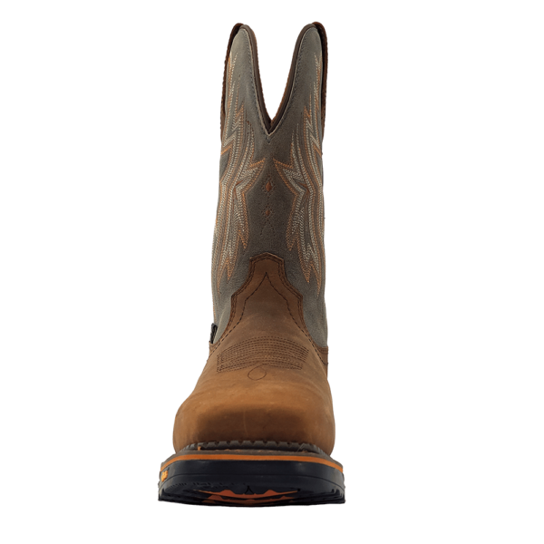 R. Watson presents these cowhide square toe waterproof work boots. These work boots have a 10 row stitch pattern, removable orthotic insole, EVA midsole, Vibram unit sole. They are EH, slip and oil resistant. 12" total in height.