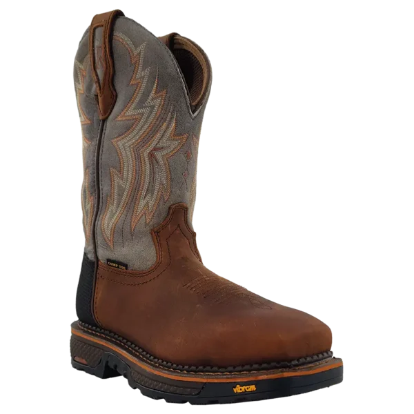 R. Watson presents these cowhide square toe work boots. These work boots have a 10 row stitch pattern, removable orthotic insole, EVA midsole, Vibram unit sole. They are EH, slip and oil resistant. 12" total in height.