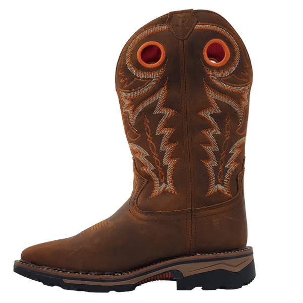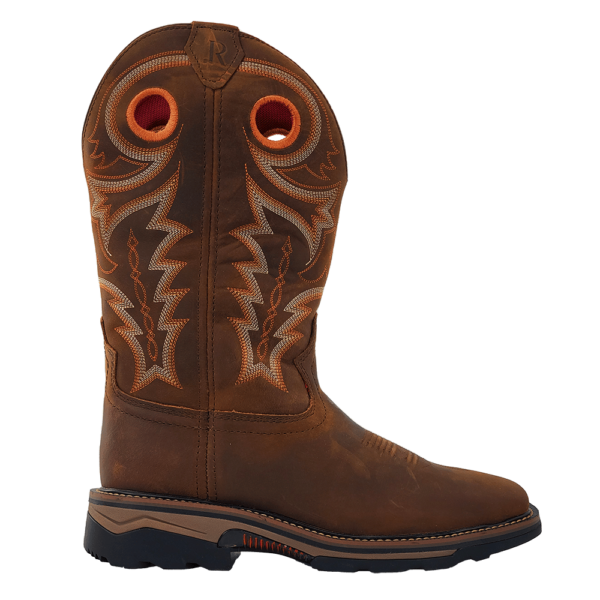 R. Watson presents these cowhide wide square steel toe, waterproof work boots. These work boots have a 10 row stitch pattern, removable orthotic insole, EVA midsole, medium duty rubber outsole. They are EH, slip and oil resistant. 12" total in height.