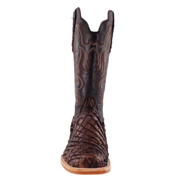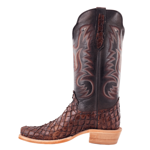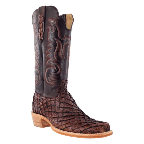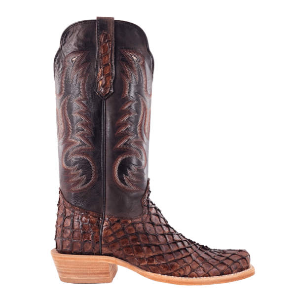 R. Watson presents these pirarucu and goat western boots. These boots have a 10 row stitch pattern, R. Watson comfort system, all leather stacked heel, counters, solid steel shank, and 10 iron outsole. 13" total in height.