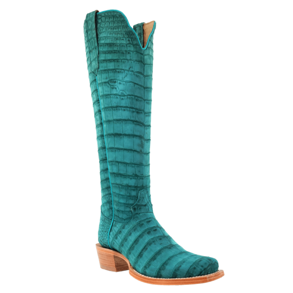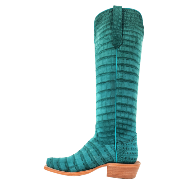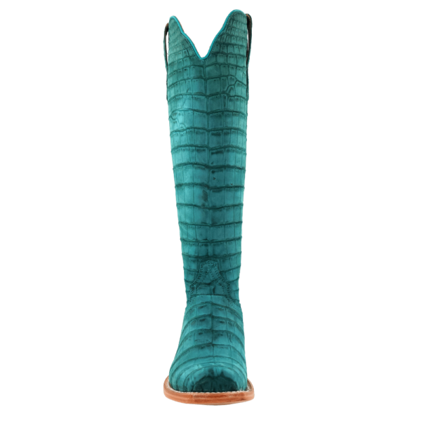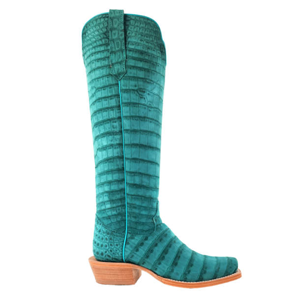 R. Watson presents these 17" top and bottom turquoise sueded American alligator boots. These boots have the R. Watson comfort system, all leather stacked heel, counters, solid steel shank, and 10 iron outsole. 17" total in height.