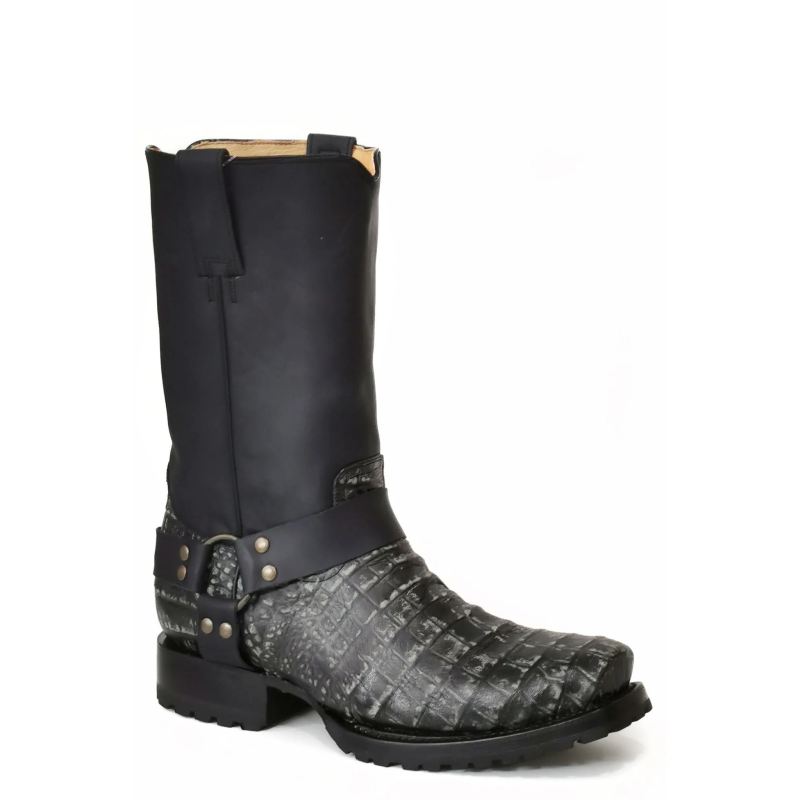 - ROPER | MEN'S VINTAGE BLACK EMBOSSED CAIMAN VAMP BIKER TOE WITH HARNESS-BROWN