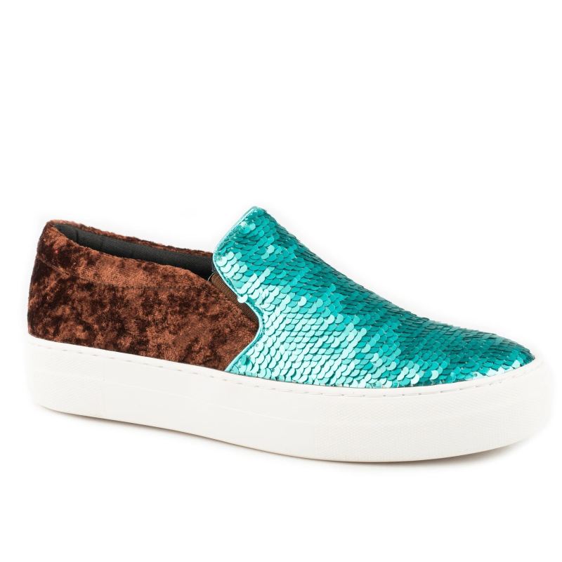 - ROPER | WOMEN'S ATHLETIC SNEAKER SLIP ON TURQUOISE AND SILVER SEQUINS ON VAMP WITH BROWN VELVET HEEL-BLUE