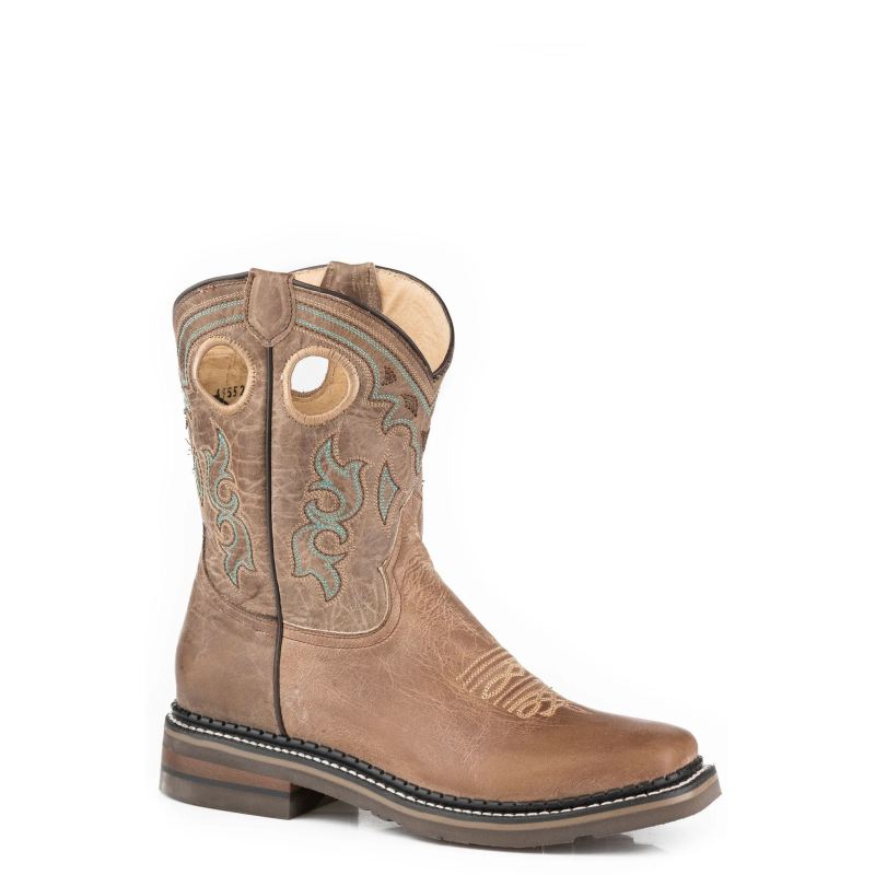 - ROPER | WOMEN'S FASHION COWBOY BOOT BURNISHED TAN FAUX LEATHER WITH ALL OVER EMBROIDERY-TAN