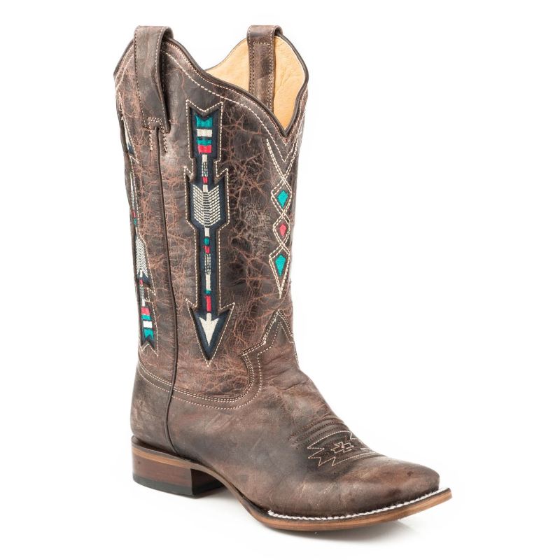 - ROPER | WOMEN'S LEATHER COWBOY BOOT WAXY BROWN WITH EMBROIDERED AZTEC DESIGN-BROWN