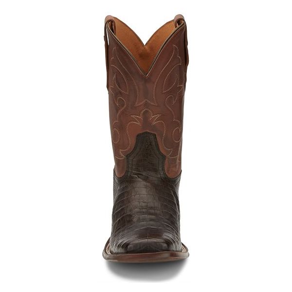The 11" Canyon Boot in Brown from our 1911 Collection is crafted with a burnished tan leather upper and a burnished caiman belly tail foot in a deep brown coffee tone. Featuring our cushioned comfort insole, it's finished with a channel square toe and western walking heel.