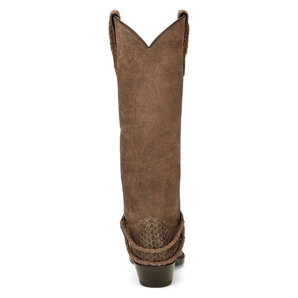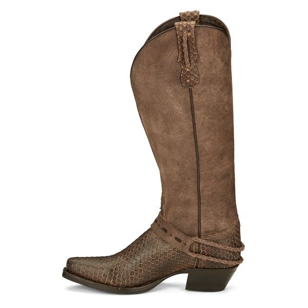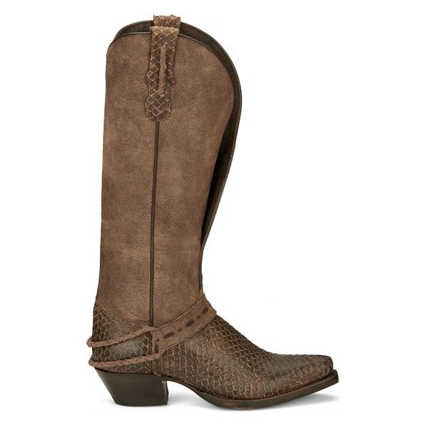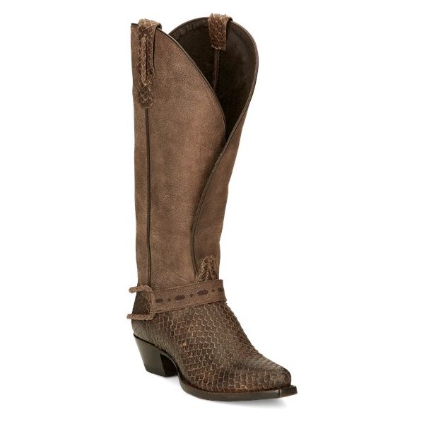 Featuring a scalloped topline and feminine crossover front, this lovely tall silhouette from our Vaqueras collection gets gorgeous texture from a snake print vamp and pull straps. Style the reversible harness strap in your choice of three different ways to make this look all your own.