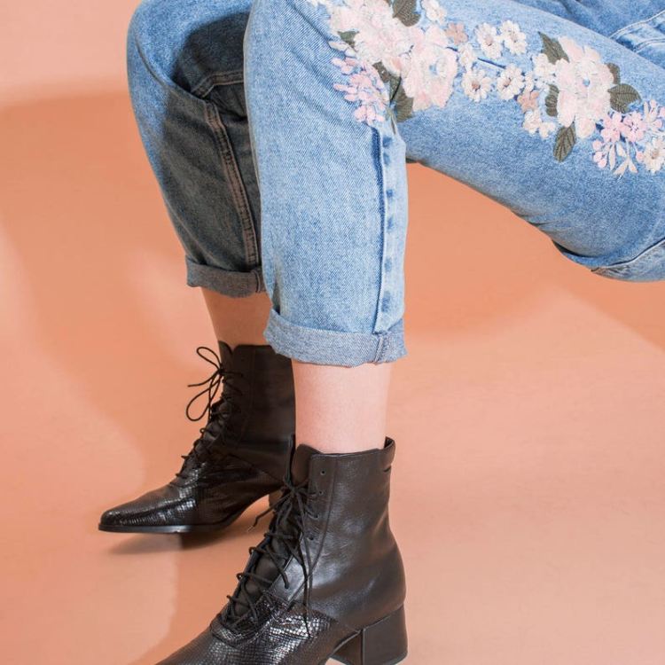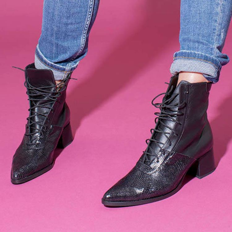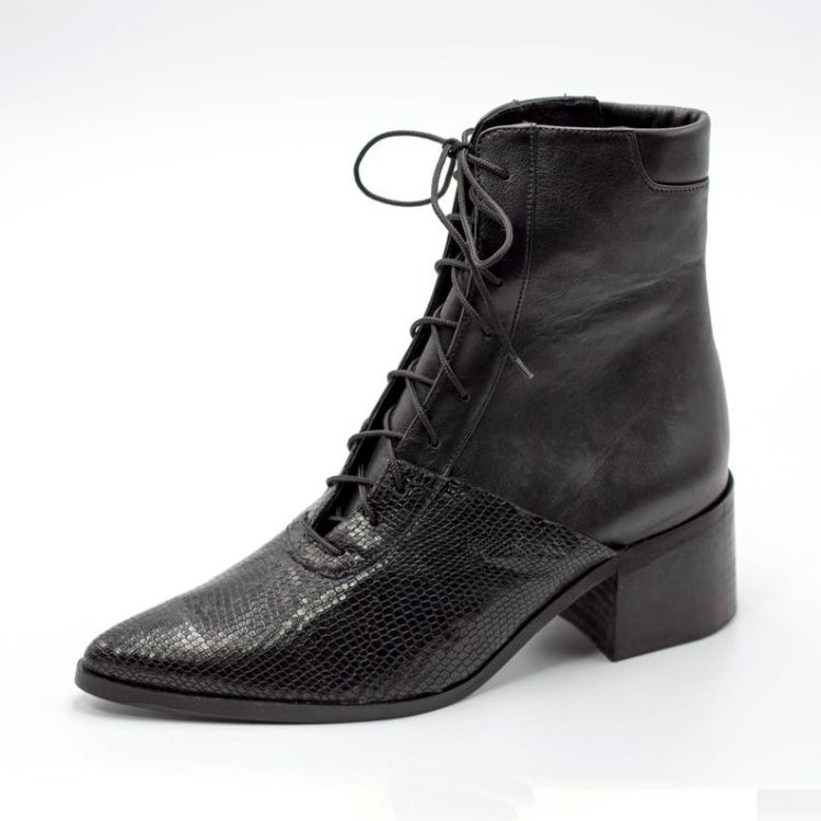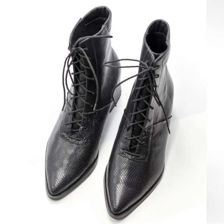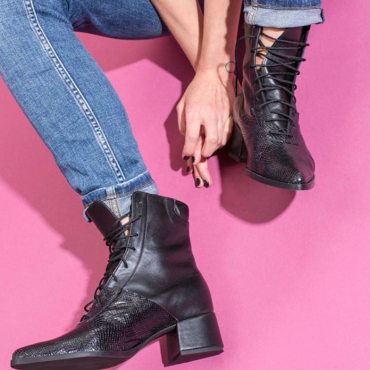 These Amazing booties have two leather combination- one solid black and another lizard textured, in a line crossing the feet.