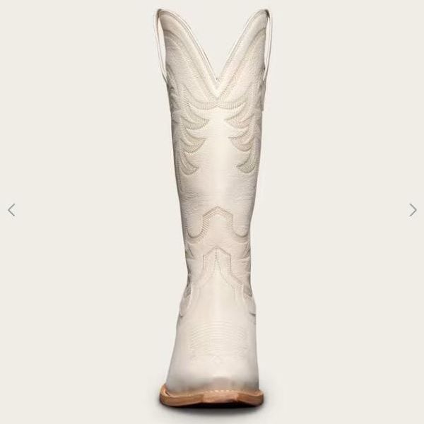 Our newest cowgirl boot features a tall, angled heel and 14" shaft adorned with a beautiful stitched pattern in gradient tonal thread. The shaft features a deep scallop for a comfortable, flattering fit and the new snip toe is complemented by classic toe bug stitching. These premium boots are not to be missed and will age beautifully over time. Available in bovine and suede.