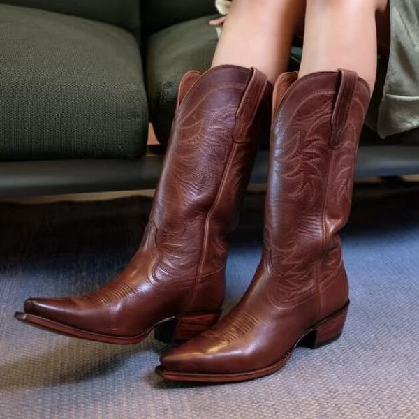 Our newest cowgirl boot features a tall, angled heel and 14" shaft adorned with a beautiful stitched pattern in gradient tonal thread. The shaft features a deep scallop for a comfortable, flattering fit and the new snip toe is complemented by classic toe bug stitching. These premium boots are not to be missed and will age beautifully over time. Available in bovine and suede.