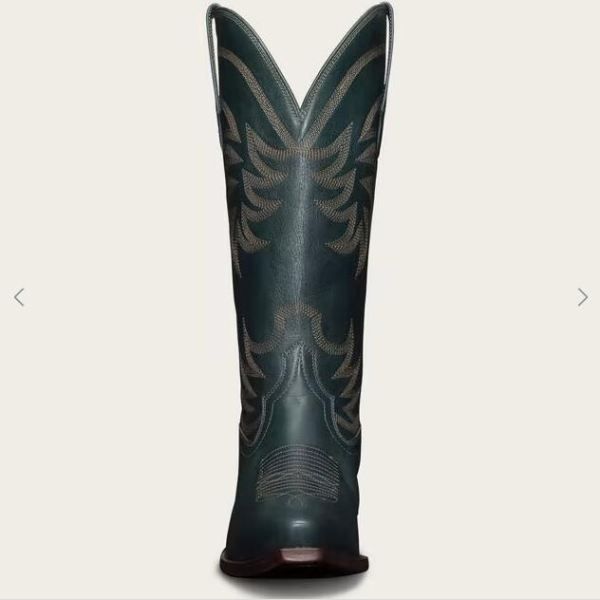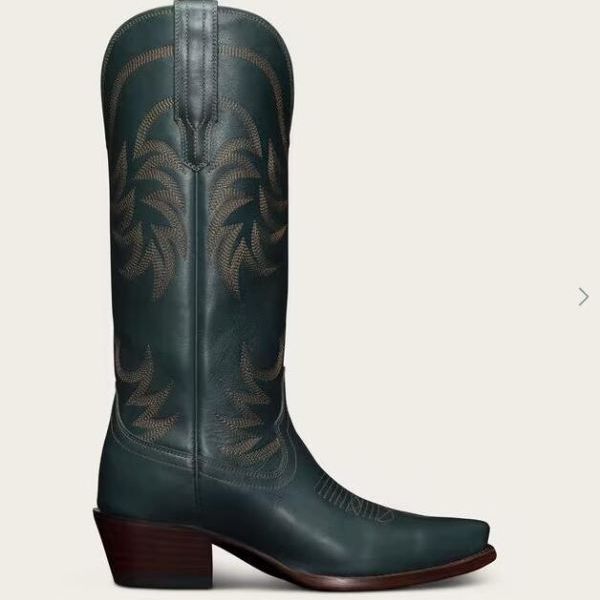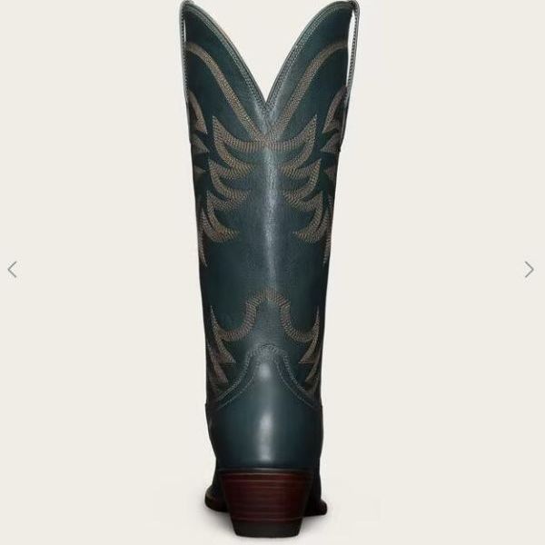 Our newest cowgirl boot features a tall, angled heel and 14" shaft adorned with a beautiful stitched pattern in gradient tonal thread. The shaft features a deep scallop for a comfortable, flattering fit and the new snip toe is complemented by classic toe bug stitching. These premium boots are not to be missed and will age beautifully over time. Available in bovine and suede.